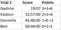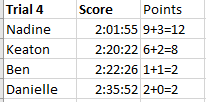 <span style="font-weight:400;">Congratulations Nadine, you have earned 3 points with your score of 24.54 seconds! Keaton earns 2 points with a score of 23.634 seconds, Ben earns 1 with a score of 18.031 and Danielle earns 0 with a score of 14.863. </span><span style="font-weight:400;">