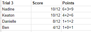 </p><p><font face="Kalam" size="5">Congratulations, Nadine you have earned another 3 points! Keaton earns 2 points with a time of 32:57, Danielle earns 1 point with a time of 43:48 and Ben earns 0 with a time of 68:44<span style="font-weight:400;">